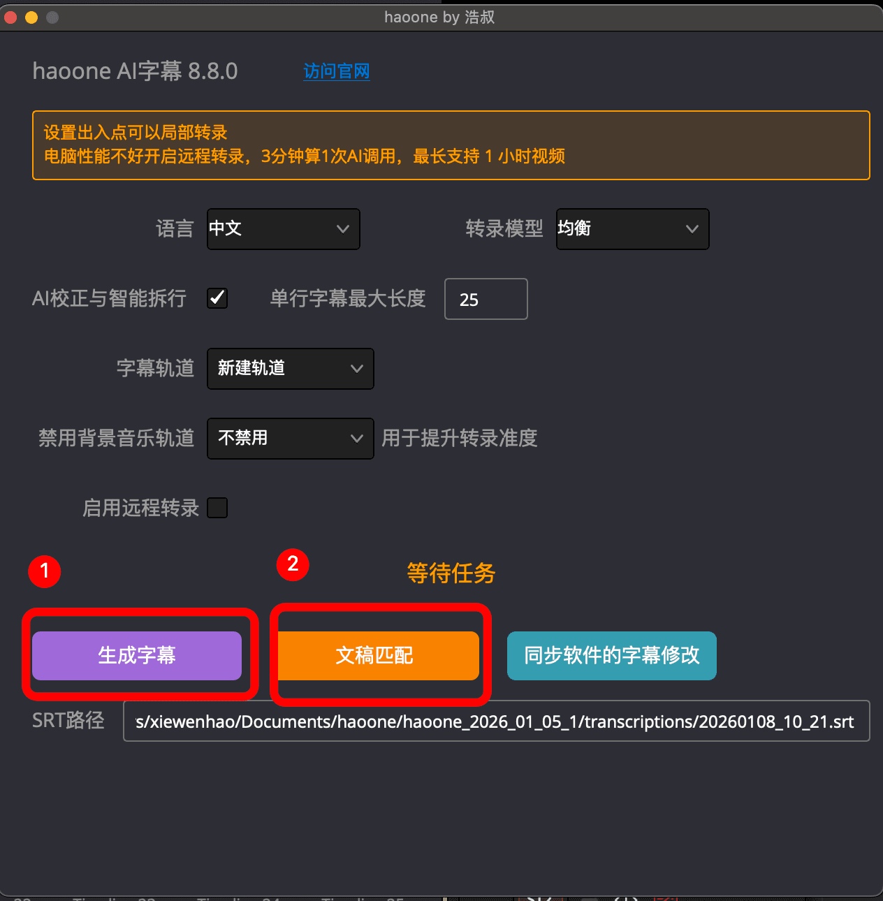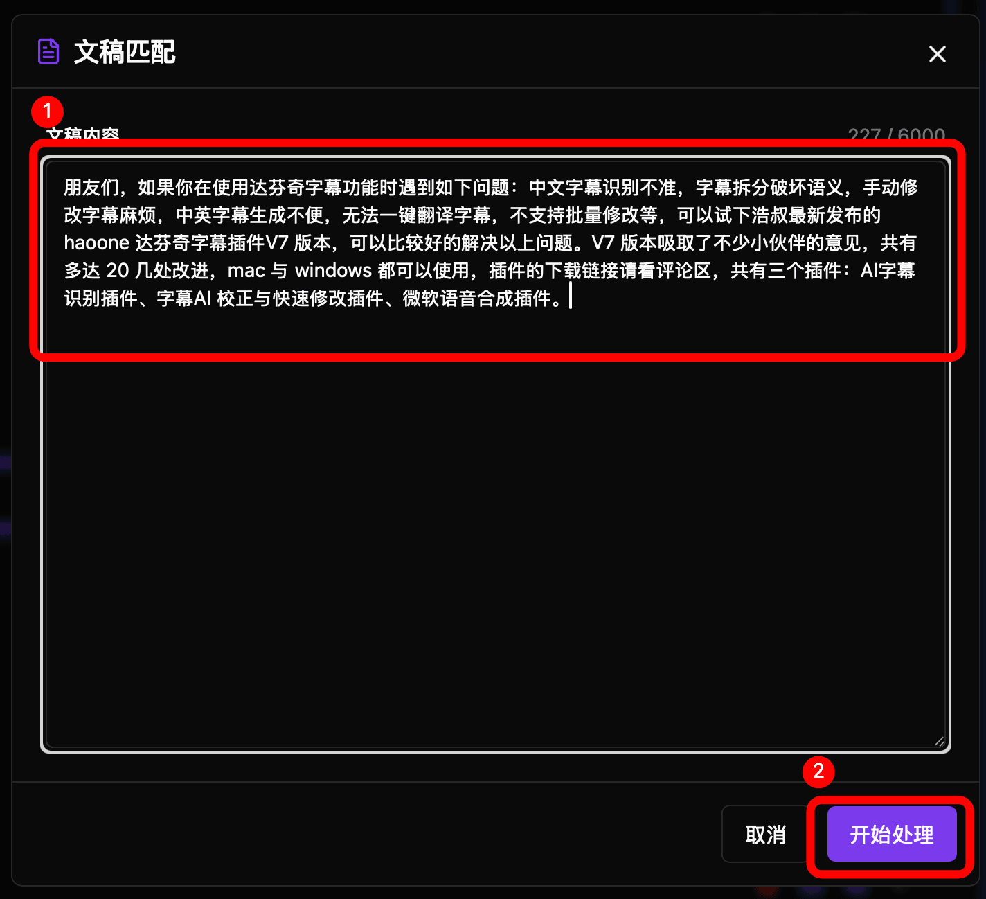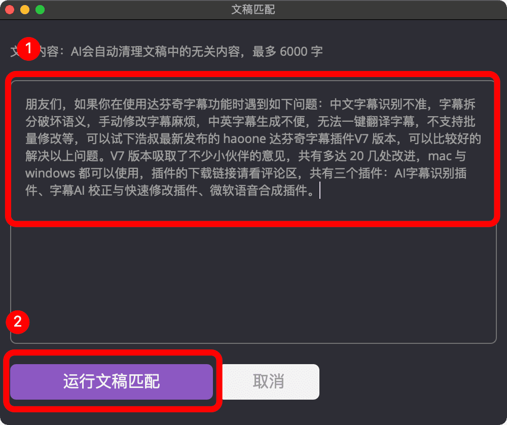 文稿匹配操作必须在转录操作后,不支持非 haoone 转录的字幕。单次处理字数限制在 6000 字以内。