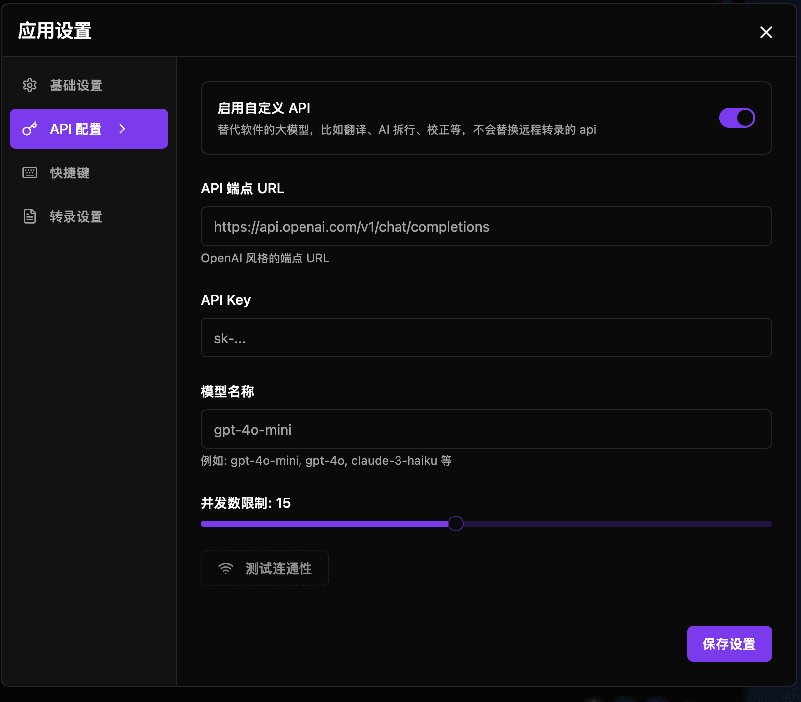 haoone 支持自定义配置大模型 API,一旦开启,除了远程转录外,所有用到大模型的地方都会使用自定义的 API。